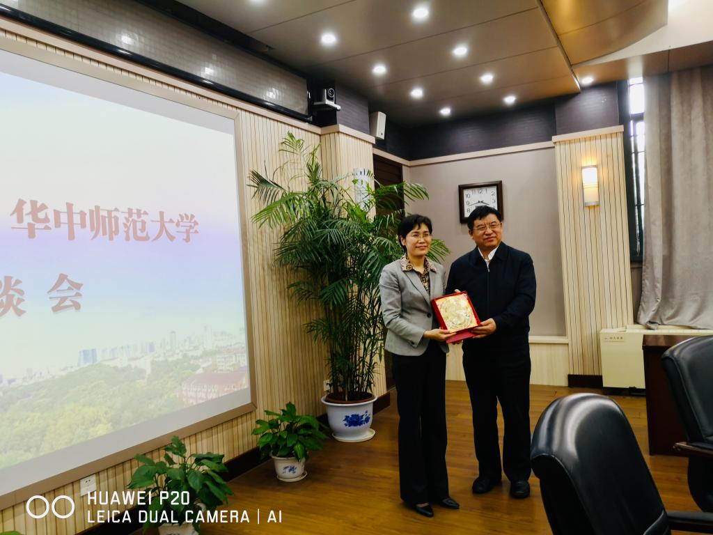 我校党委书记朱炳文向华中师范大学党委书记黄晓玫赠送我校的纪念品