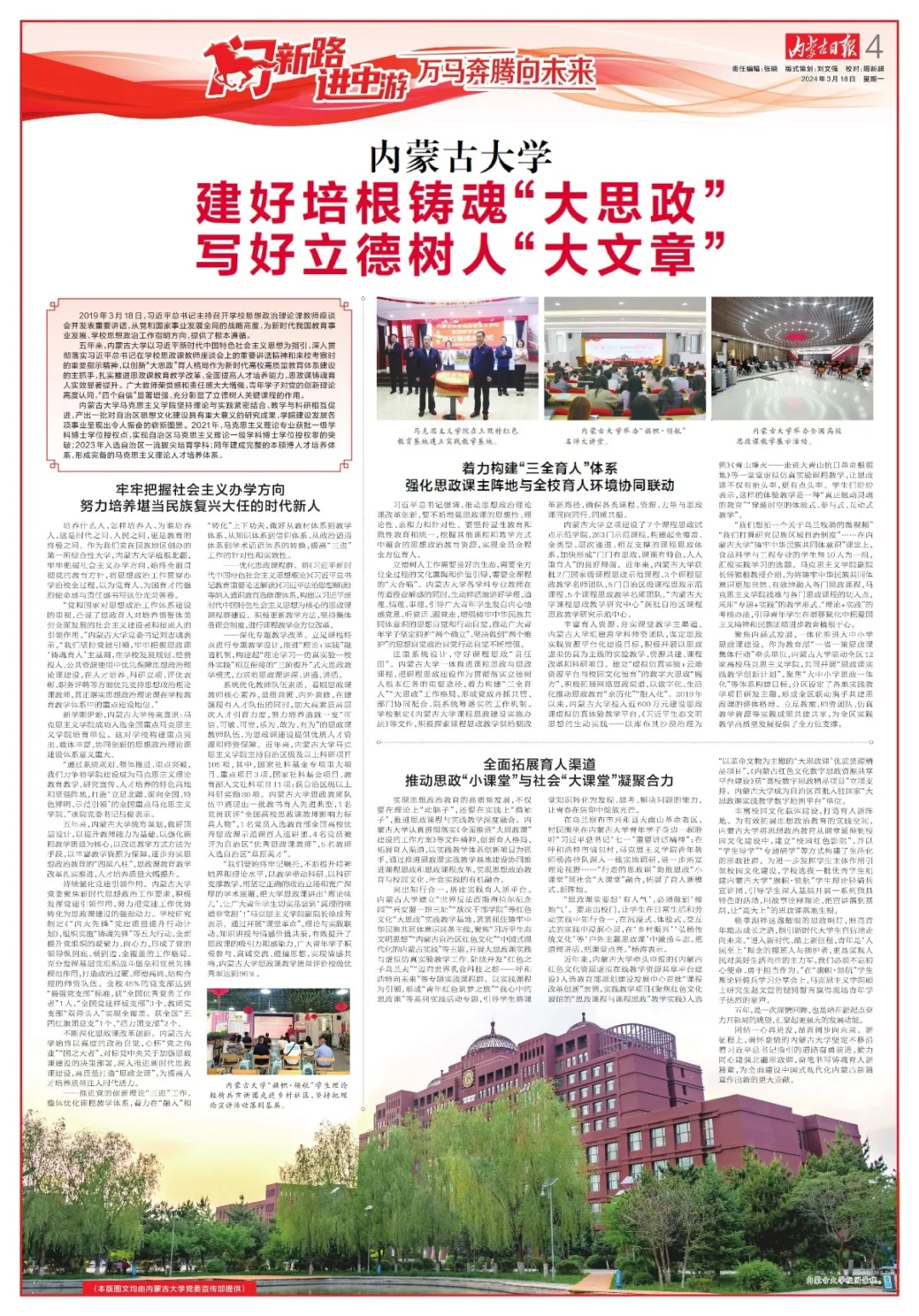 不断深化思政课改革创新。内蒙古大学始终以高度的政治自觉,心怀“党之伟业”“国之大者”,对标党中央关于加强思政课建设的决策部署,深入推进新时代思政课建设,高质量打造“思政金课”,为提高人才培养质量注入时代活力。