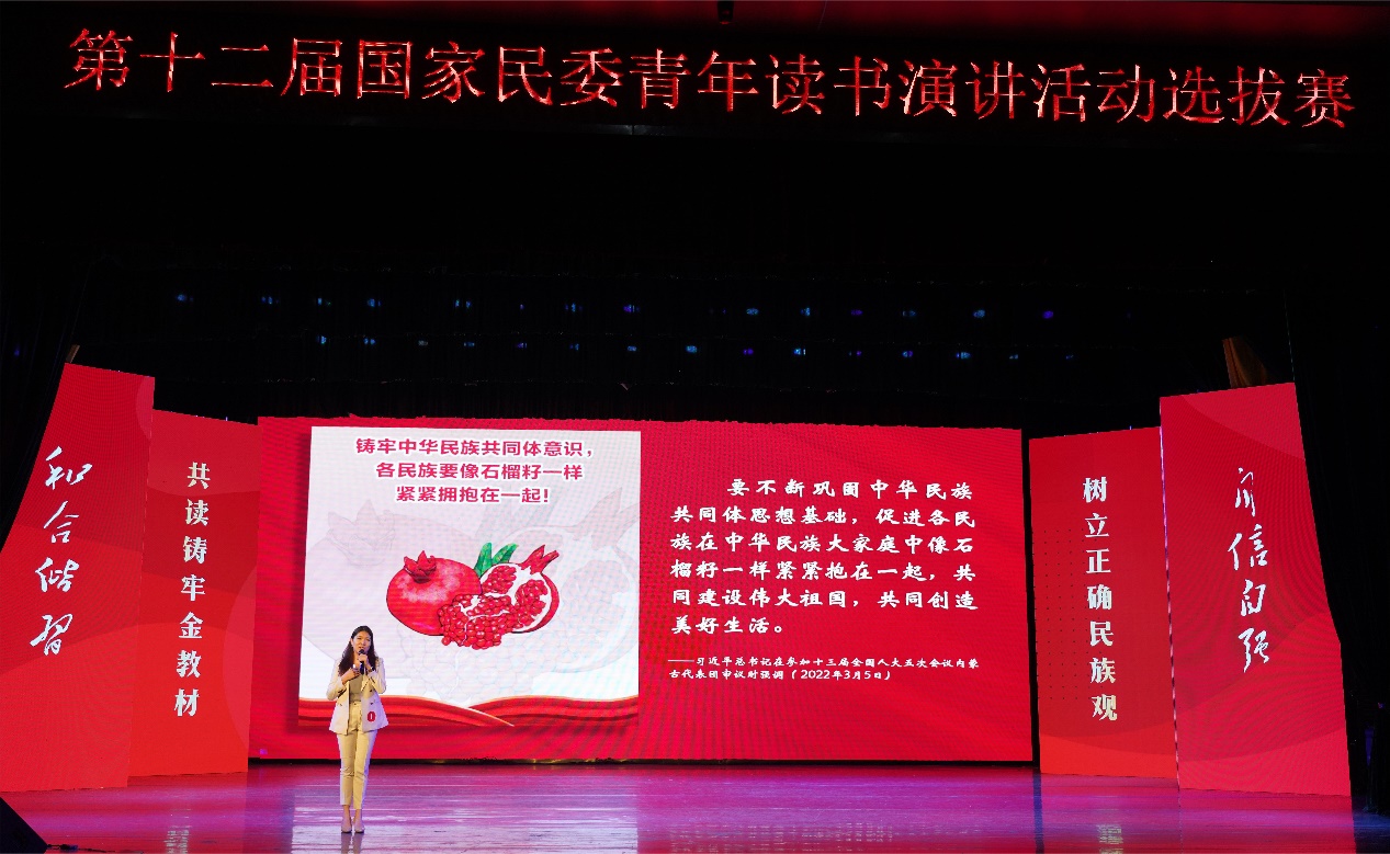 4月18日至19日,由国家民委直属机关团委主办的“共读铸牢金教材 树立正确民族观”第十二届国家民委青年读书演讲活动选拔赛在西南民族大学举办。我校团委副书记薛辉带队、马克思主义学院铸牢中华民族共同体意识教研室教师李辰参加此次活动。选拔会上,国家民委机关各部门、直属各单位和13所民族(地区)高校的56名青年选手聚焦“铸牢”主线,围绕学用《中华民族共同体概论》,结合工作实际,从理论研究、文化传承、历史故事、教书育人、文物古籍、文艺创作等多个维度展示学习成果、畅谈心得体会。西南民族大学400余名师生代表现场观看。