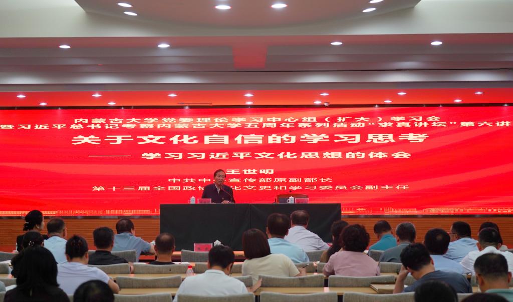 5月30日下午,我校党委理论学习中心组在赛罕校区学术会议中心8号会议室召开(扩大)学习会,邀请中宣部原副部长、中央精神文明建设指导委员会办公室原专职副主任、第十三届全国政协文化文史和学习委员会副主任王世明作专题辅导报告。校党委书记刘志彧主持会议,党委副书记乔彪,纪委书记、自治区纪委监委驻内蒙古大学纪检监察组组长张利平,副校长刘永斌、周建涛及全校副处级以上领导干部和思政课教师代表参加会议。本次学习会也是习近平总书记考察我校五周年系列活动“求真讲坛”的第六讲。
