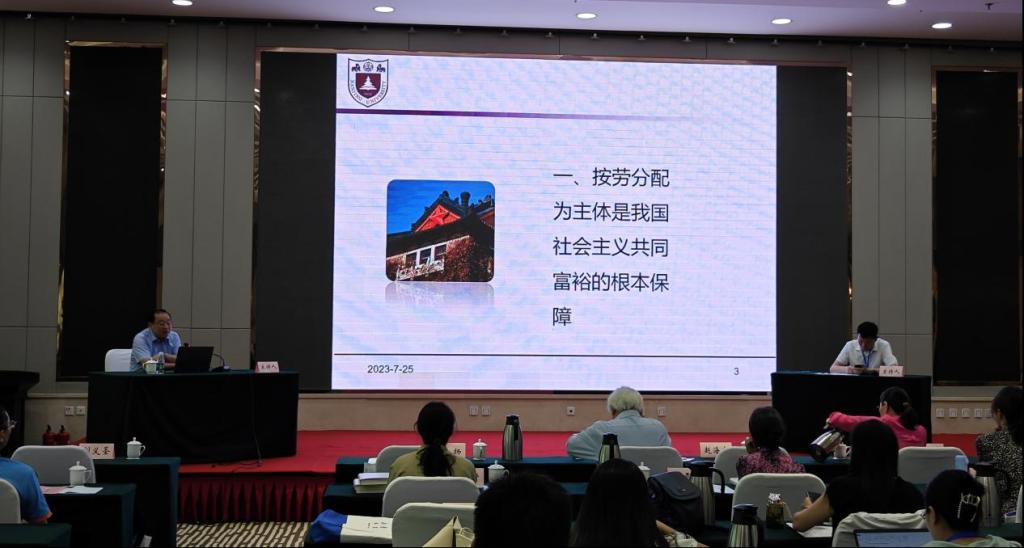 第二阶段主题报告由葛扬教授主持。学会副会长、浙江宁波财经学院国际经贸学院、浙江越秀外国语学院数字贸易学院王永龙教授作了题为《加快推进以县城为重要载体的新型城镇化建设:重点方向与路径选择》的主题报告。西南财经大学经济学院蒋南平教授作了题为《中国式现代化、共同富裕与乡村振兴:基于农村居民收入状况改善视角》的主题报告。学会副会长、南京师范大学商学院陶士贵教授作了题为《中国式现代化与中国式反经济制裁》的主题报告。
