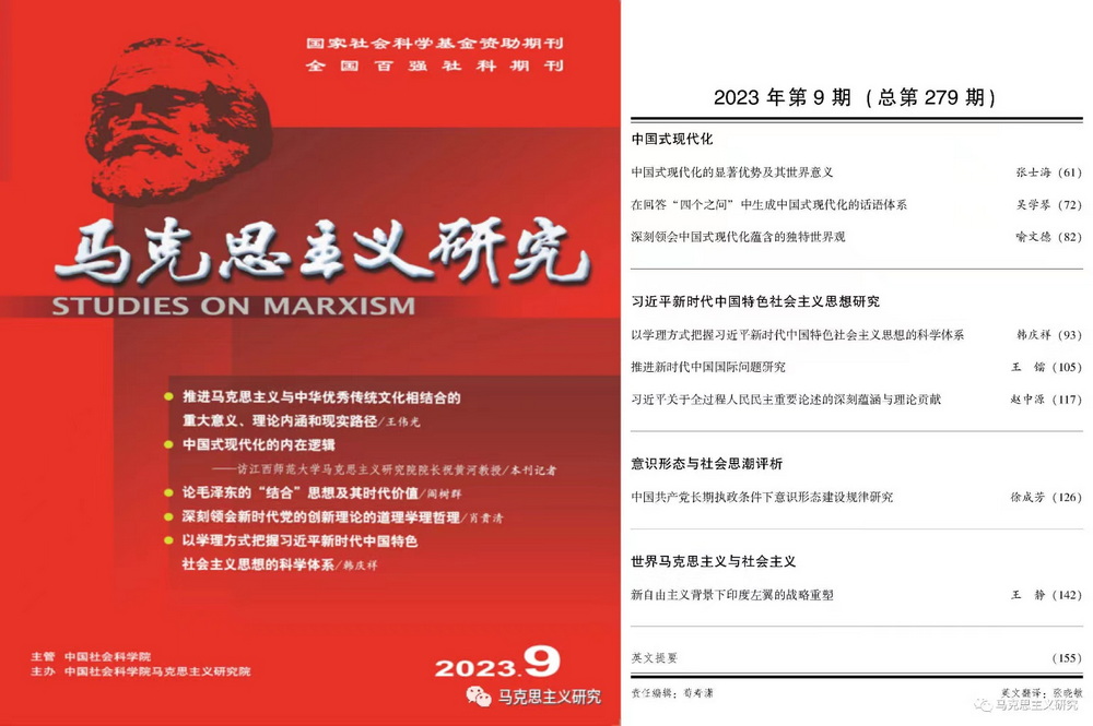 日前,《马克思主义研究》(2023年第9期)刊发徐成芳教授文章的题目是《中国共产党长期执政条件下意识形态建设规律研究》,是国家社科基金项目的阶段性成果,全文约25000字。