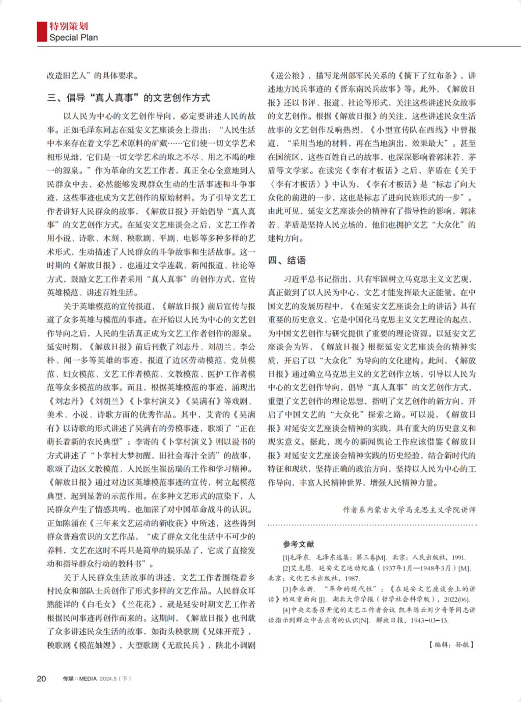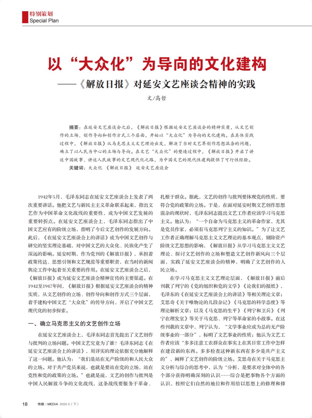 高哲老师在《传媒》发表论文(《以“大众化”为导向的文化建构——<解放日报>对延安文艺座谈会精神的实践》)