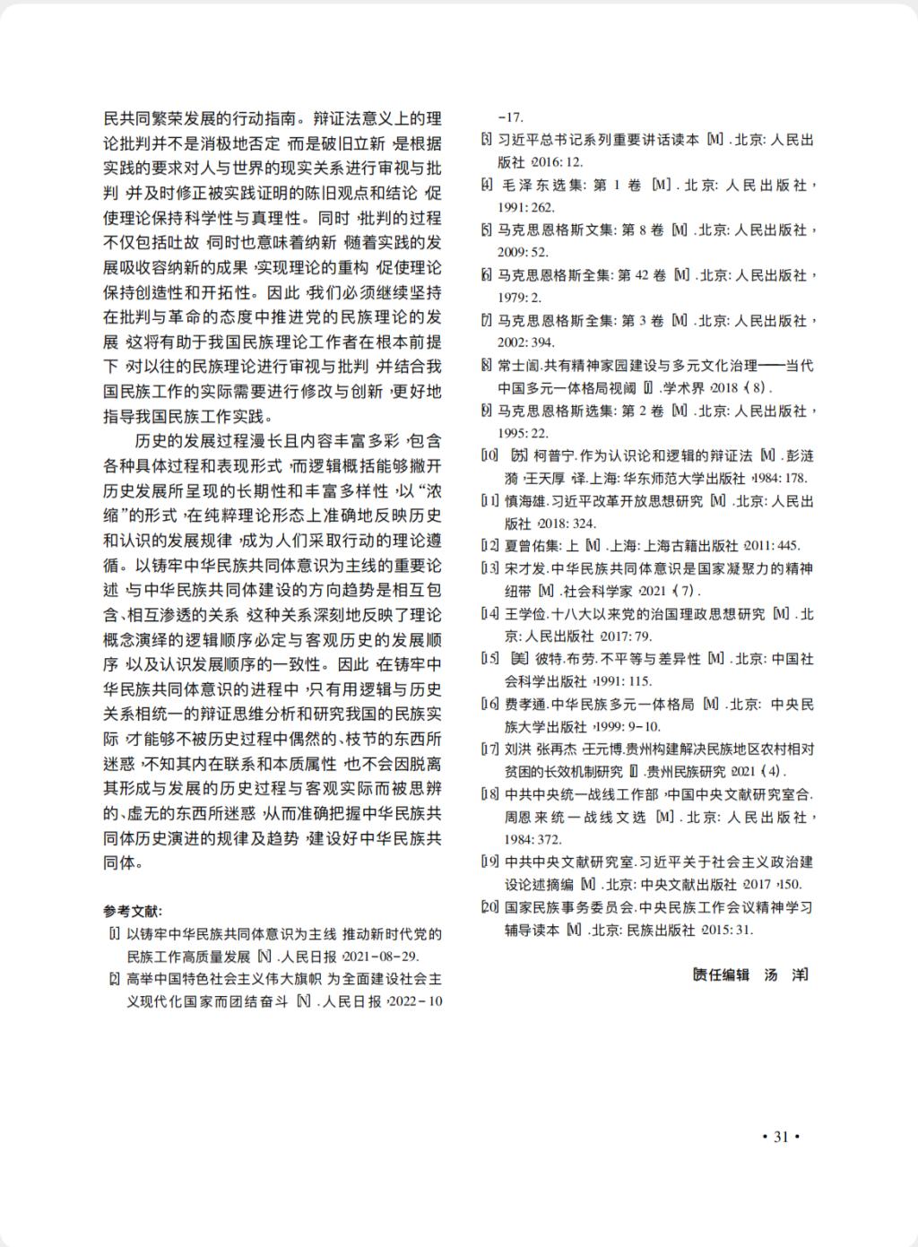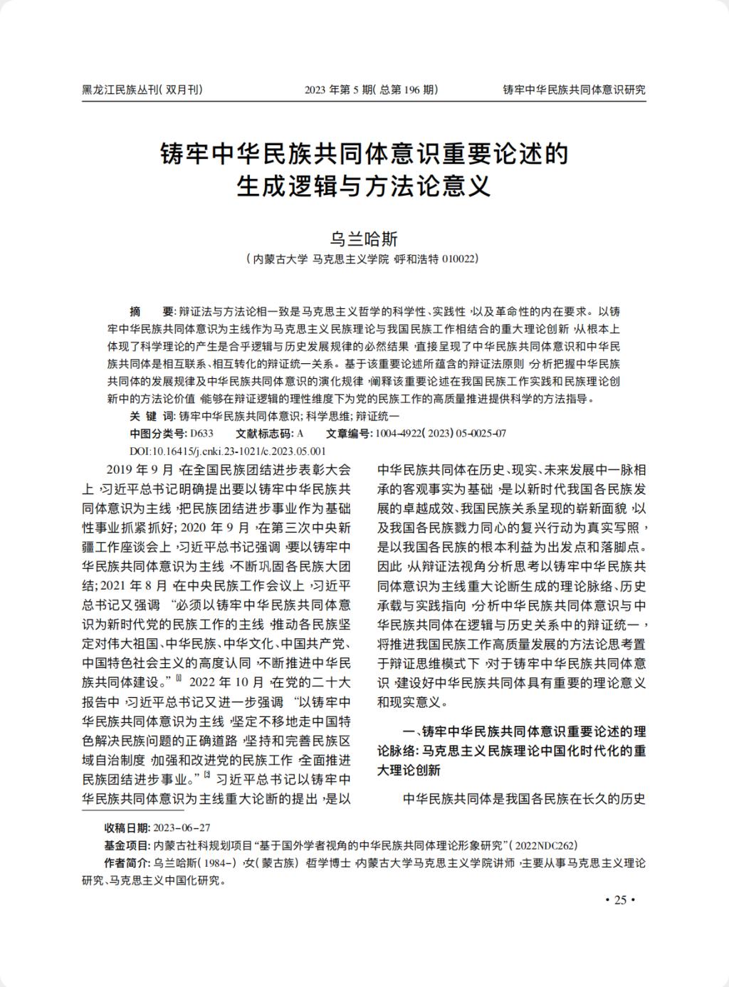 乌兰哈斯老师在《黑龙江民族丛刊》中发表论文(《铸牢中华民族共同体意识重要论述的生成逻辑与方法论意义》)
