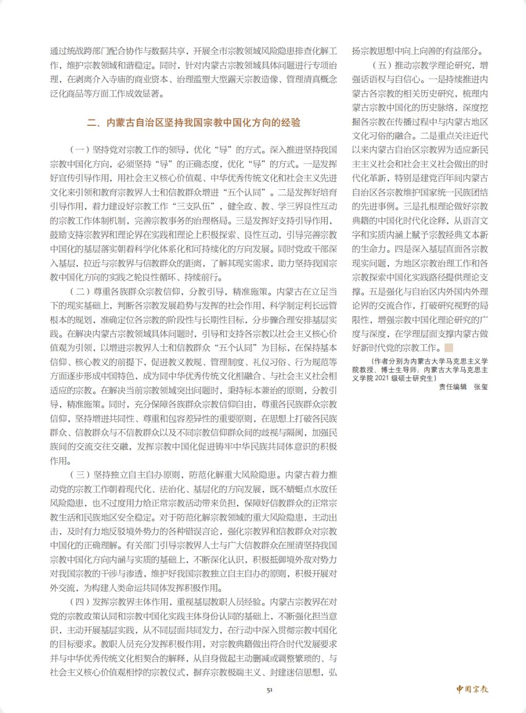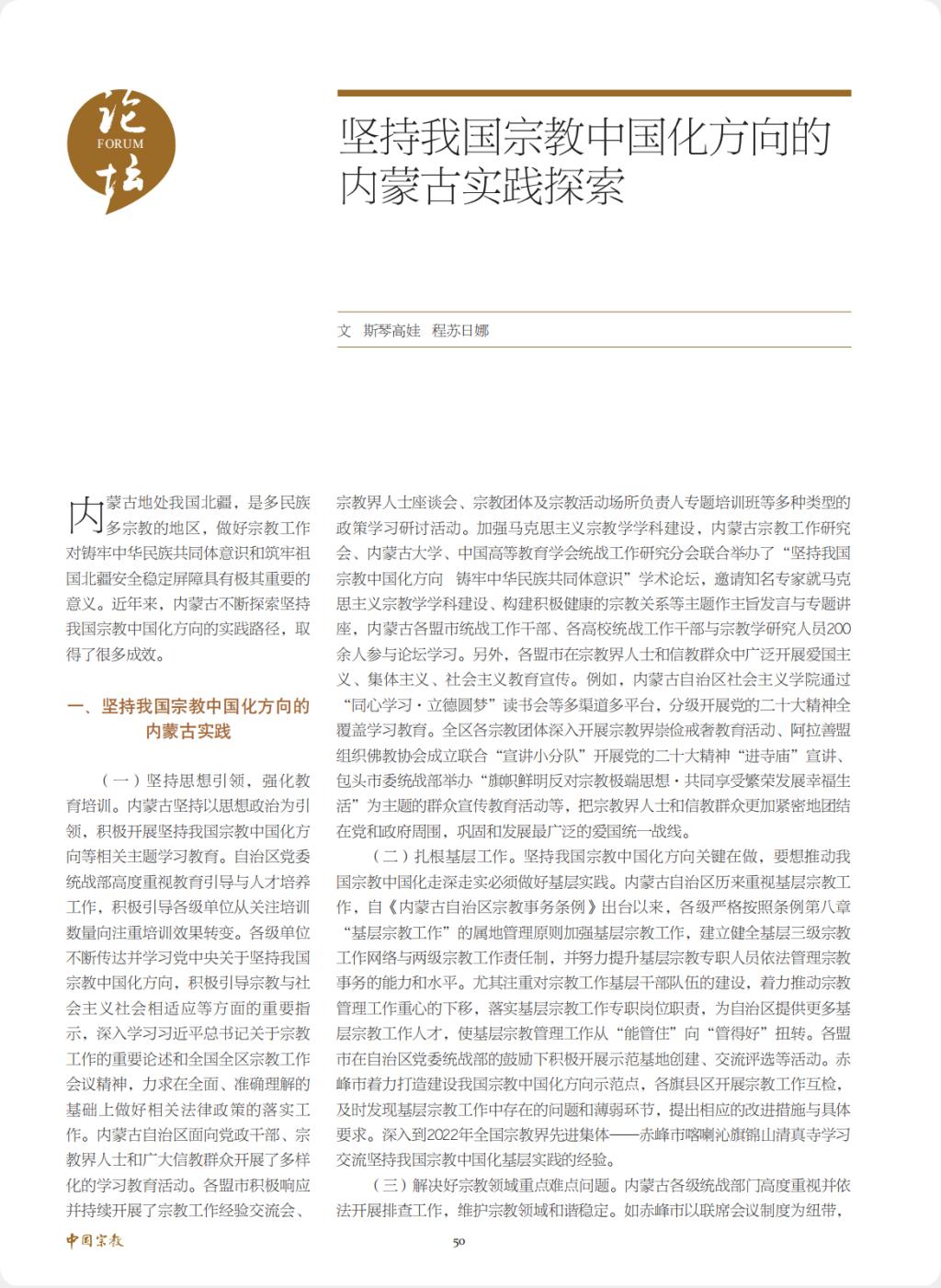 斯琴高娃教授在《中国宗教》发表论文(《坚持我国宗教中国化方向的内蒙古实践探索》)